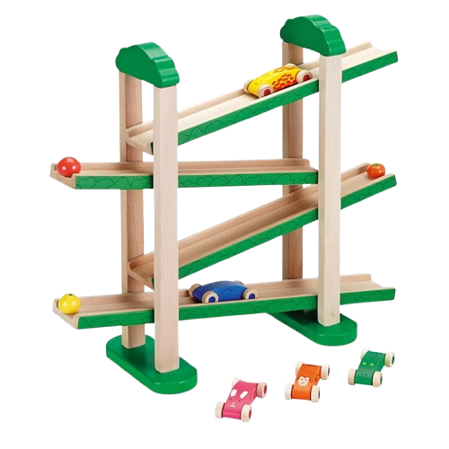 動物の車を上から置くと、スロープを転がっていく木製トイ。