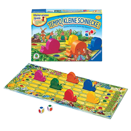 色サイコロ2つだけで進む、カラフルな6匹のかたつむりのゆっくりレース!